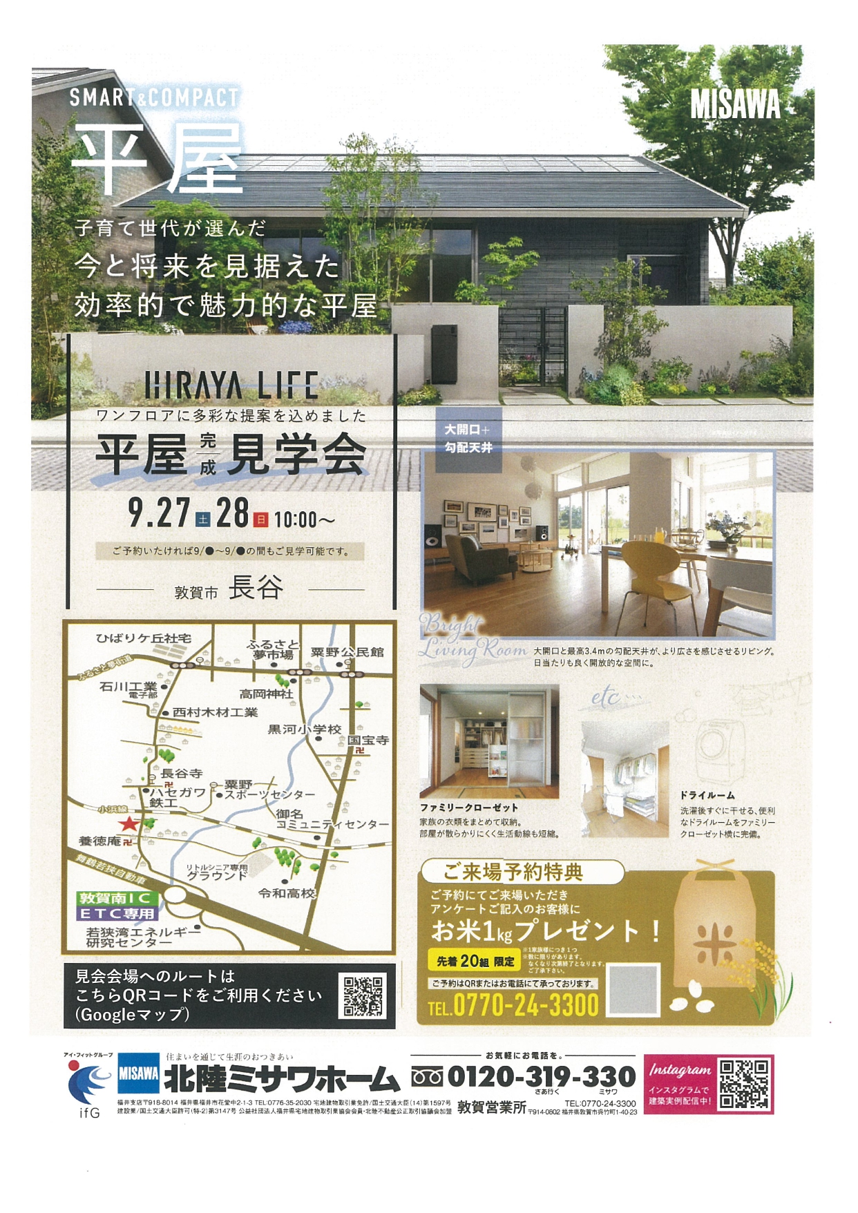 北陸ミサワホーム > 新着情報バックナンバー > 【敦賀営業所:9/27(土)・28(日)】敦賀市長谷にて 今と将来を見据えた平屋 完成見学会開催