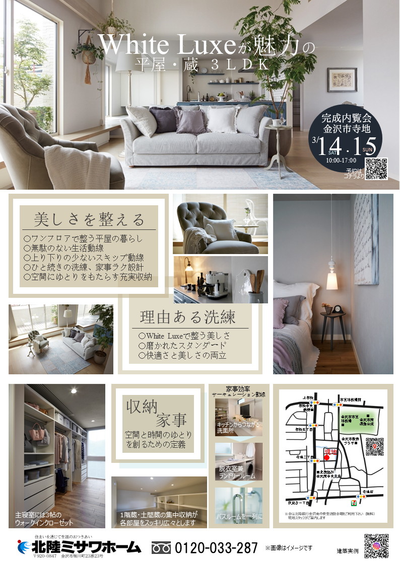 北陸ミサワホーム > 新着情報バックナンバー > 【金沢支店:3/14(土)・15(日)】金沢市寺地にて White Luxeが魅力の平屋・蔵 完成内覧会